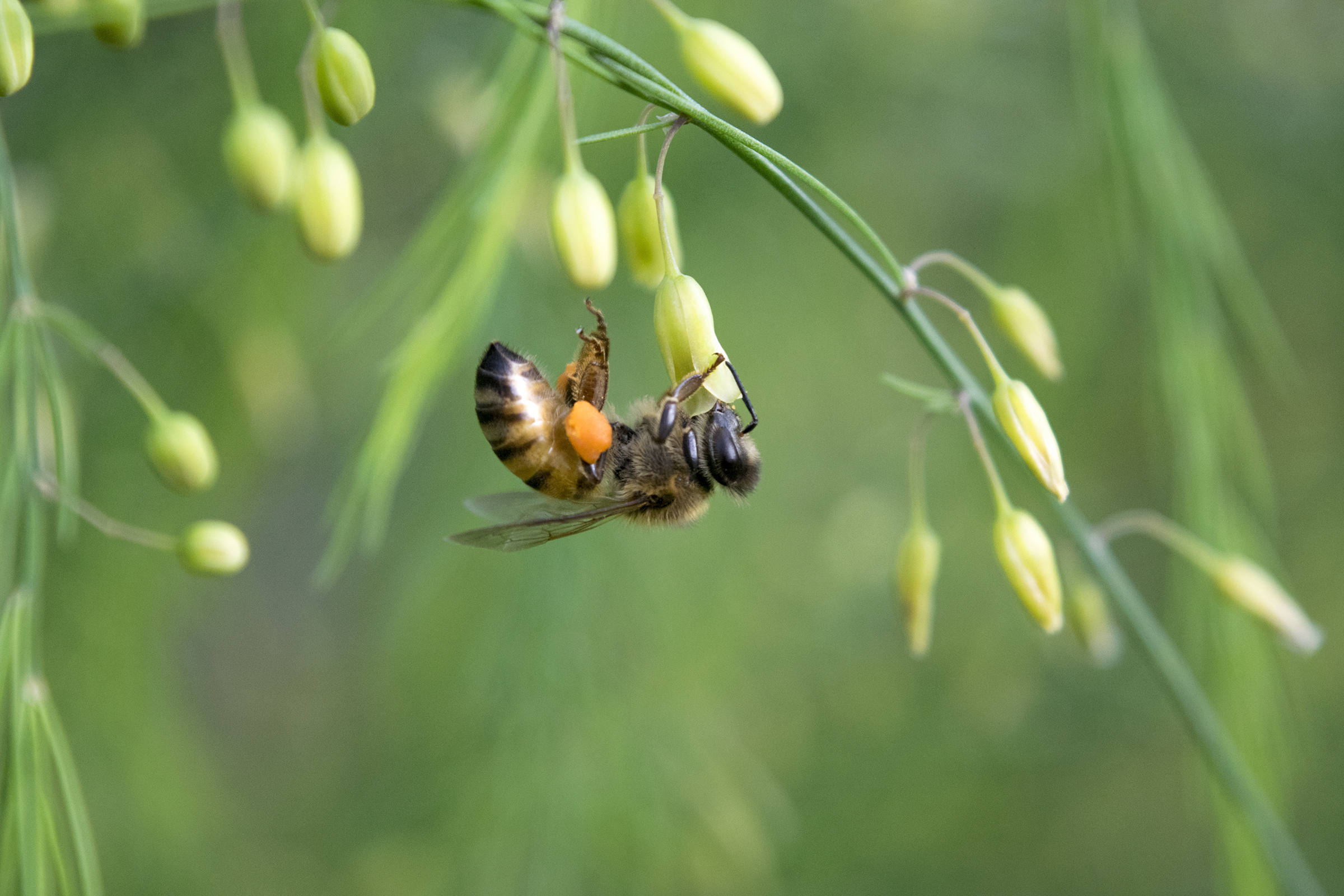 These guys have been hanging around (literally) our asparagus plants ever since they started blooming. I’ve had a great time watching them try to get from flower to flower as they navigate the foliage.