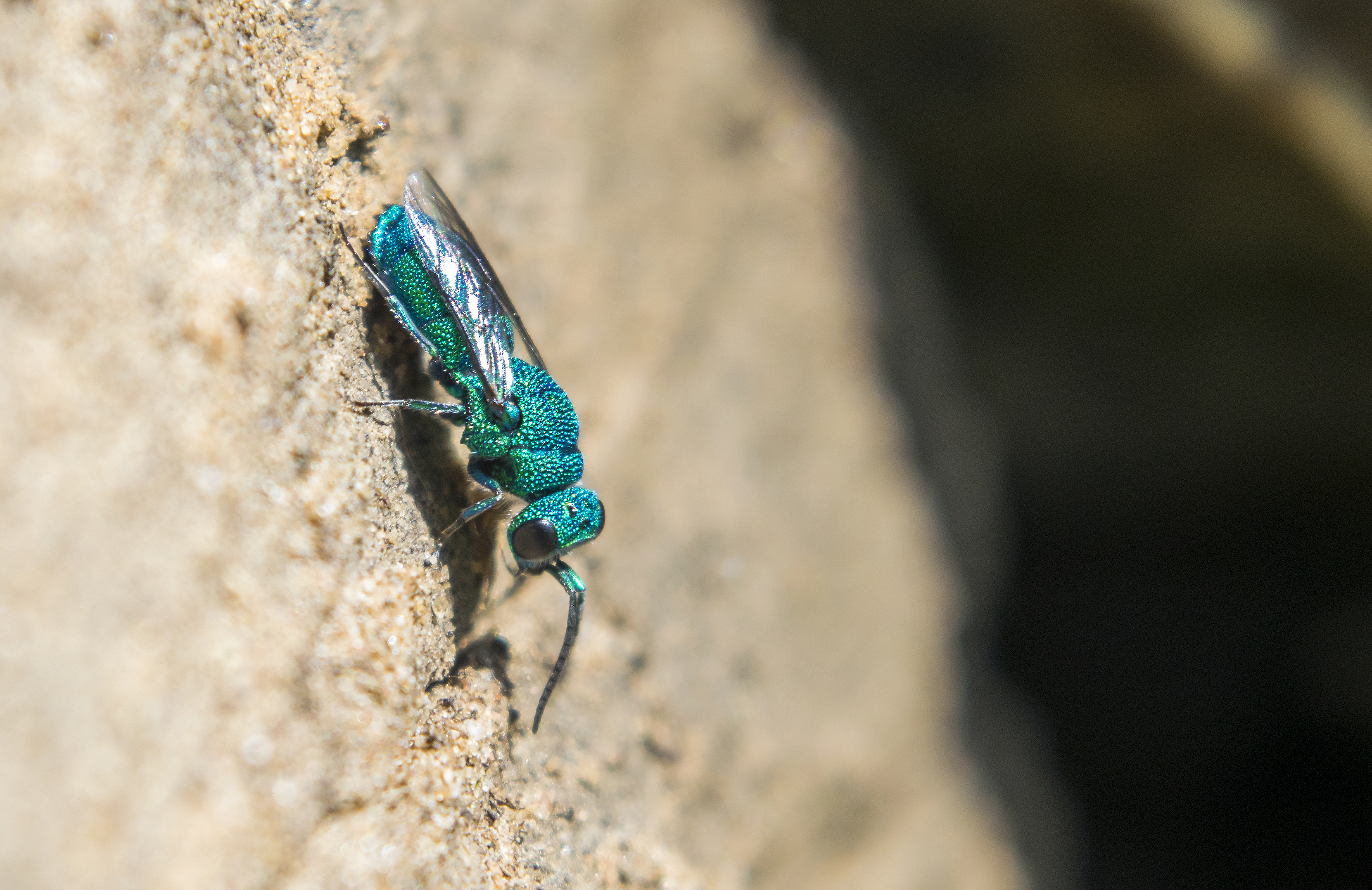 Cuckoo wasps are very different than most of the wasps you’re likely familiar with, like a hornet or red wasp. Most of the wasps you see feed on nectar and other insects. Their nests made of paper, the chambers housing the eggs resembling honeycombs. Cuckoos though, are kleptoparasites. They hunt for other wasp nests, climb inside, and lay their egg on the other’s egg (parasite). The particular wasp nests they hunt are ones that will store a paralyzed insect inside their burrow, then seal it inside for the young to devour once they hatch. Cuckoo larva hatch faster than their prey’s because, once they emerge from the egg, they not only eat the other wasp’s offspring but their stored food as well (klepto [they steal]).