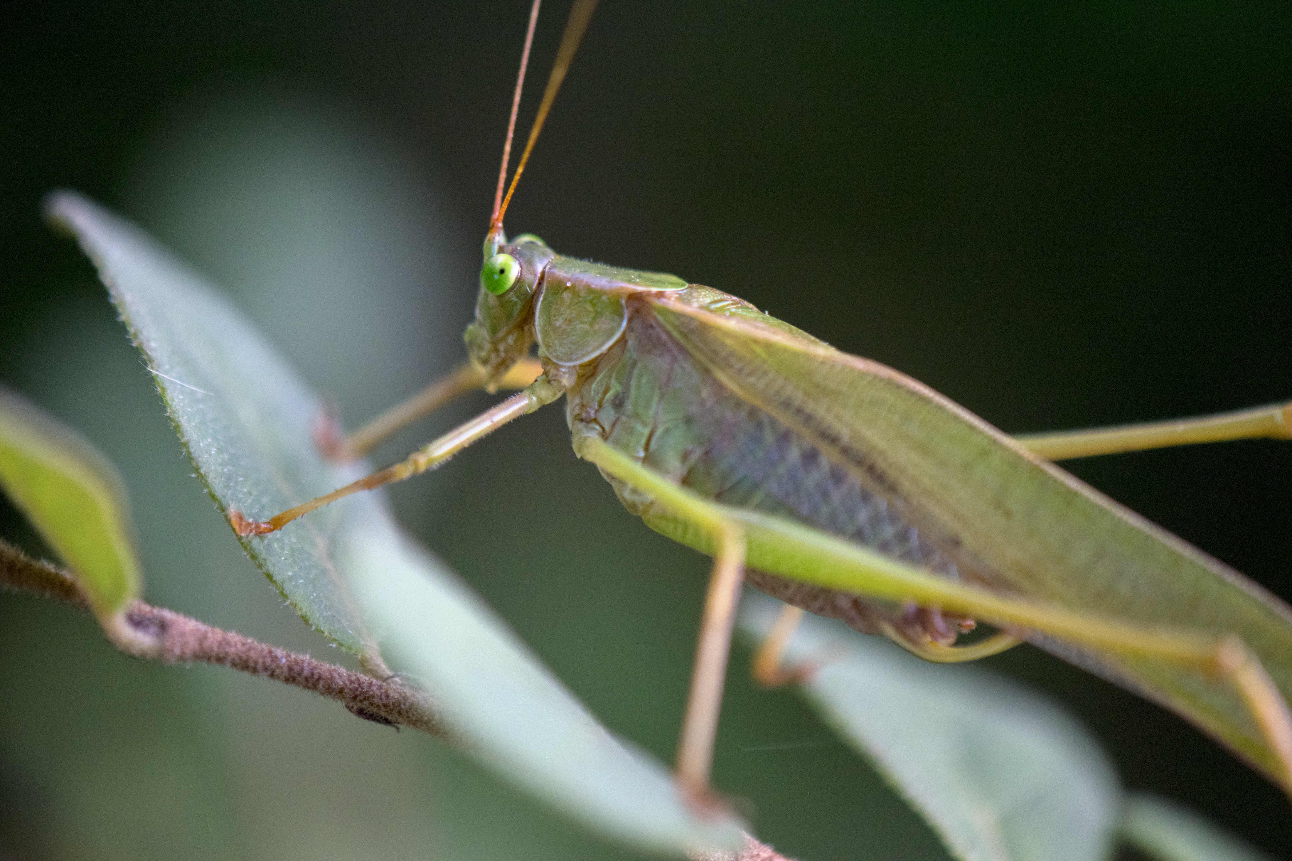 I am having trouble identifying the species of Katydid that this is. The photo was taken in late October, so it’s coloring is not what you commonly see.
